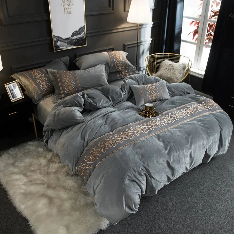 Transform your bedroom into a sophisticated retreat with our Luxury Embroidered Velvet Duvet in Silver Grey. This duvet exudes modern elegance with its sleek silver-grey tone, which complements a variety of decor styles. Crafted from premium velvet, it provides a soft, plush texture and excellent warmth. The detailed embroidery enhances its luxurious appeal, making it a stunning centerpiece for any bedroom.